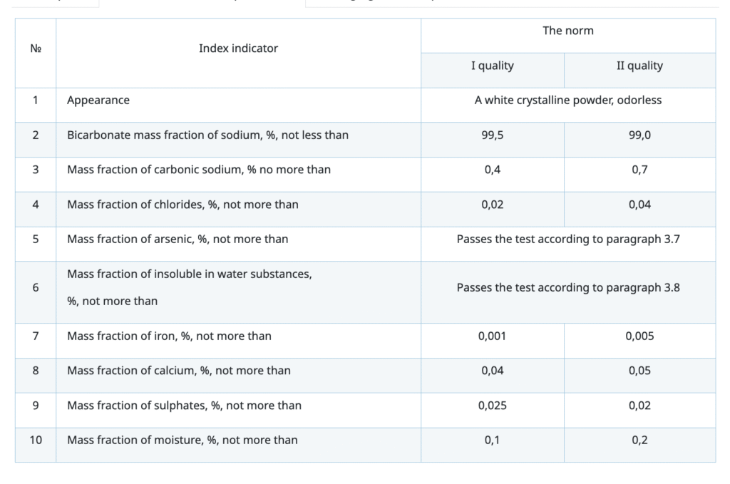 Safety requirements: Sodium bicarbonate is non-toxic, fire-and explosion-proof. By the degree of influence on the human body belongs to the 3rd class of danger.